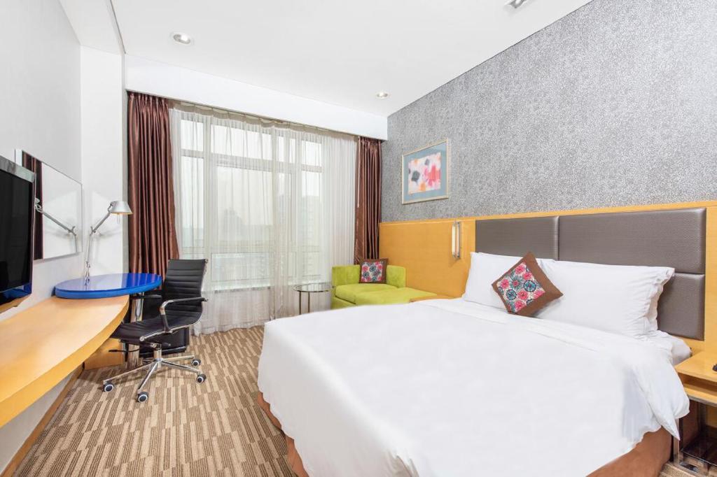 The Holiday Inn Express is conveniently situated in the embassy district, only a short stroll away from the lively Sanlitun Bar Street. Upscale rooms equipped with complimentary Wi-Fi are offered. The fitness center and massage couch are available to guests at no cost. Guests of the Holiday Inn Express Beijing Dongzhimen may reach the subway stations Dongsishitiao (Line 2) and Dongzhimen (Line 2 and the Capital Airport Express) on foot in about fifteen minutes. The Forbidden City and Tiananmen Square are around 8 miles away. Both JingA Brewpub and Great Leap Brewing are within a two-minute stroll. The distance between Raffles City and Dongzhimen Ginza Mall is around 1.6 kilometers. From Dongzhimen Bus Terminal, it’s 1.2 kilometers. You can reach Capital International Airport by driving in about half an hour. The air-conditioned rooms include large windows, plenty of desk space, and a couch for your comfort. Along with the coffee/tea maker, you will also find an iPod dock. At the travel counter, you may book tours and get tickets for families. There is a self-service laundry room and an ATM for your added convenience. The business centre’s six PCs are available to guests at no cost. In addition to offering fixed lunch and dinner menus, the chic dining room serves a substantial buffet breakfast. Alternately, visitors are encouraged to partake in the lobby’s freshly ground coffee and tea.