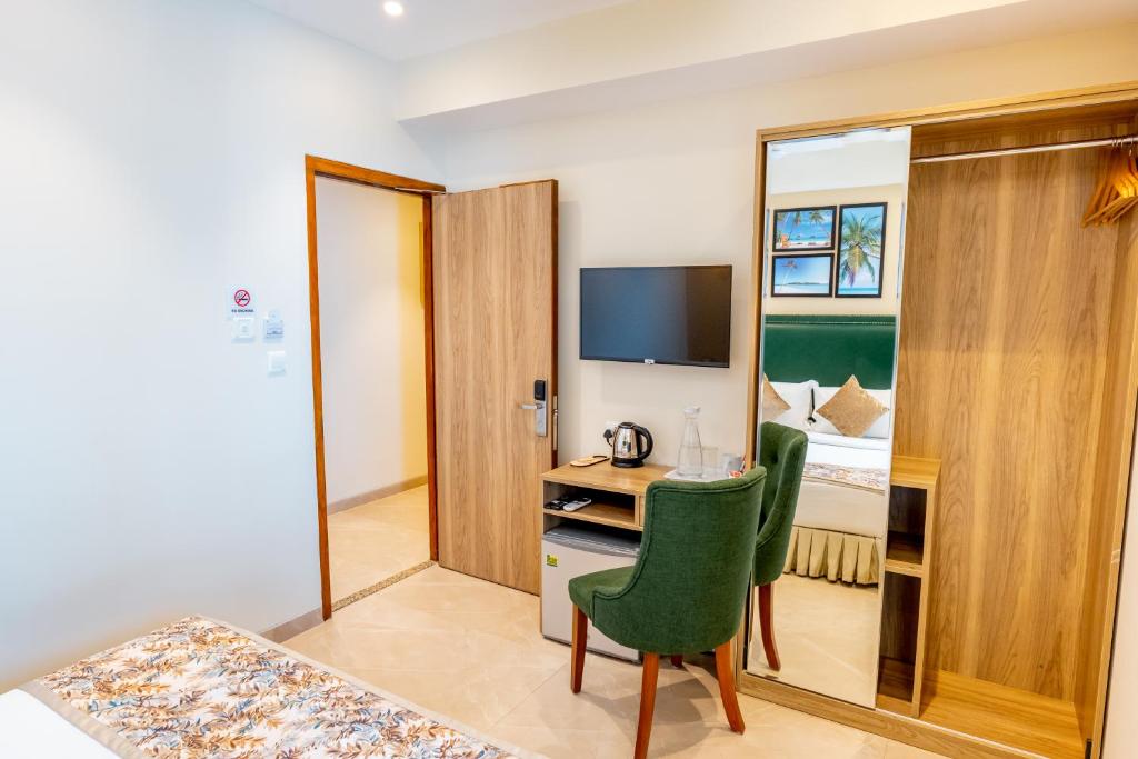 Businessman making booking at front desk with Latin receptionists in hotel lobby